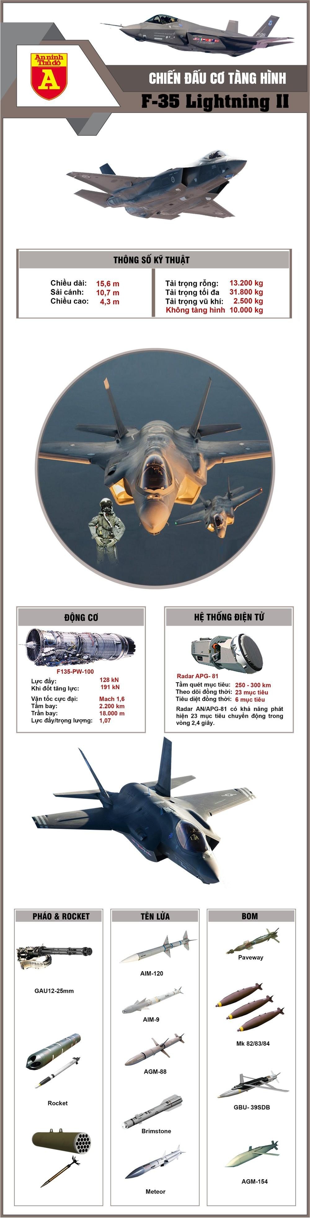 F-35 Lightning II là tiêm kích tàng hình thế hệ thứ 5 thứ 2 của Mỹ, sau F-22 Raptor. Dòng chiến đấu cơ tàng hình này được coi là xương sống trong quá trình phát triển máy bay chiến đấu tương lai của Mỹ nhờ cơ chế tàng hình tiên tiến. Tiêm kích tàng hình này còn thể hiện sự lợi hại với khả năng tiếp liệu trên không, giúp mở rộng tối đa phạm vi hoạt động. Dù là dòng tiêm kích một động cơ nhưng khả năng mang vác vũ khí rất đáng nể, khi ở chế độ tàng hình chúng có thể mang theo 2,5 tấn, nhưng khi không ở chế độ tàng hình chúng có thể mang tối đa tới 10 tấn vũ khí.