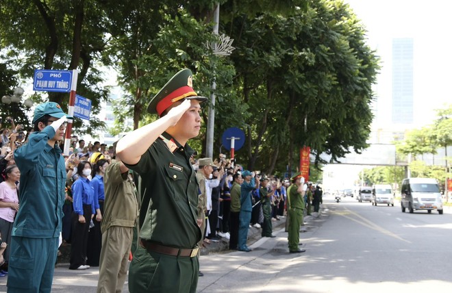 Các lực lượng công an, quân đội, dân phòng, thanh niên tình nguyện cùng đông đảo nhân dân xúc động chào khi đoàn xe tang Tổng Bí thư Nguyễn Phú Trọng đi qua. Ảnh: Minh Quân