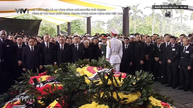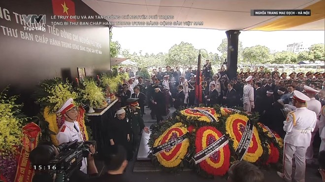 Các đồng chí lãnh đạo và nguyên lãnh đạo Đảng, Nhà nước, Chính phủ, Quốc hội, Mặt trận tổ quốc Việt Nam, gia quyến Tổng Bí thư Nguyễn Phú Trọng và nhân dân dâng hương, đi một vòng quanh tiễn biệt Tổng Bí thư, người đã tận hiến đến giờ phút cuối cùng của cuộc đời cho Tổ quốc và nhân dân. Vĩnh biệt Tổng Bí thư Nguyễn Phú Trọng.