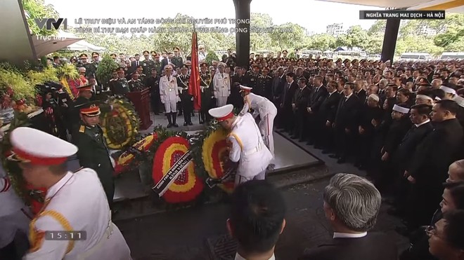 Các đồng chí lãnh đạo và nguyên lãnh đạo Đảng, Nhà nước, Chính phủ, Quốc hội, Mặt trận tổ quốc Việt Nam, gia quyến Tổng Bí thư Nguyễn Phú Trọng và nhân dân dành một phút mặc niệm vị Tổng Bí thư đáng kính.