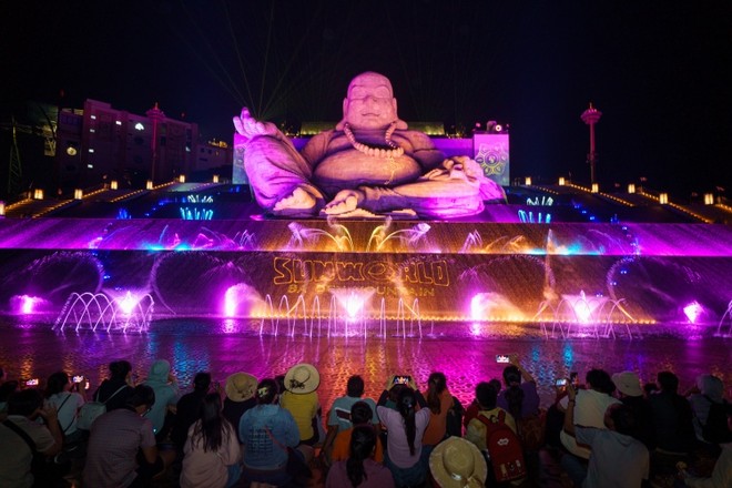 Sau đại lễ dâng đăng, hàng ngàn du khách hào hứng chiêm ngưỡng show nhạc nước ứng dụng các công nghệ hiện đại hàng đầu Việt Nam. Với tôn tượng Bồ Tát Di Lặc ở trung tâm, show nhạc nước kể câu chuyện về các cung bậc cảm xúc của thiền định bằng sự kết hợp của âm thanh, ánh sáng, nước, laser… vô cùng đẹp mắt.