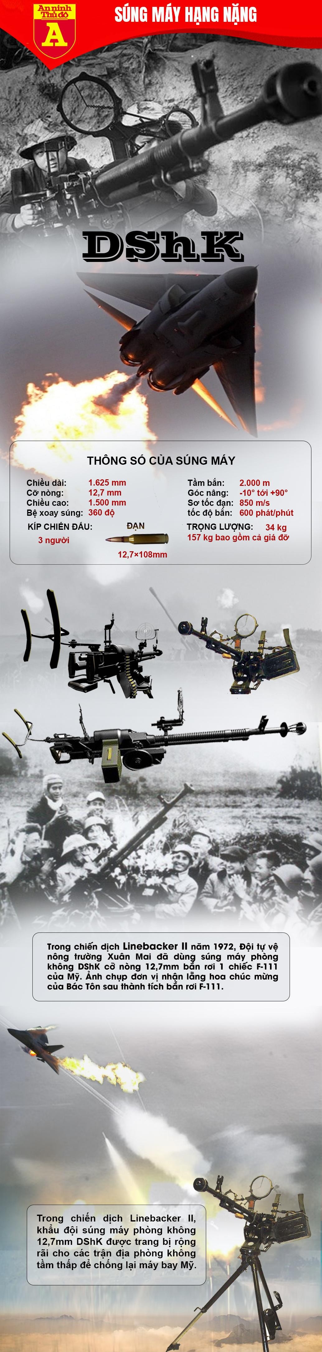 Trong chiến dịch "Điện Biên Phủ trên không" diễn ra từ ngày 18-30/12/1972 khi Mỹ đem không quân đánh phá miền Bắc Việt Nam, một khẩu đội súng máy DShK 12,7mm của Việt Nam đã bắn rơi máy bay hiện đại hàng đầu của Mỹ lúc đó là tiêm kích bom F-111.